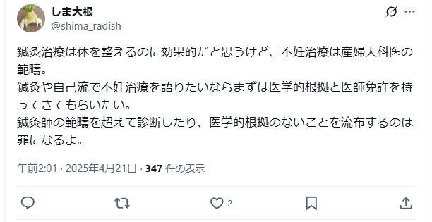 「鍼灸で体を整えるのは理解できるが、不妊治療は産婦人科医の範疇。根拠も免許もないのに語るのは無責任」といった強めの意見も投稿されています。