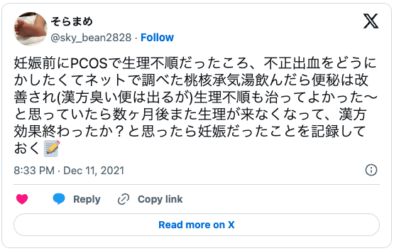 この方は、漢方を服用することで生理不順が改善し、妊娠できたようですよ。